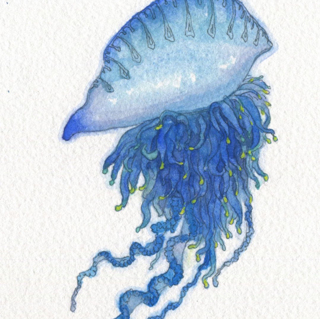 水彩紙にカツオノエボシを描きました。猛毒を持つ、青いクラゲです。