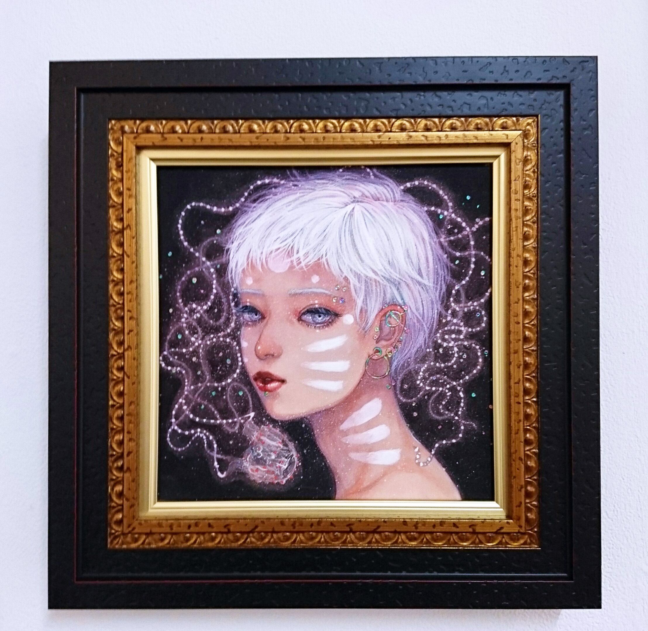 ピアス等のアクセサリーの表現には、箔を使用しております。角度を変えると、きらきらと輝く様子をご覧いただけます。